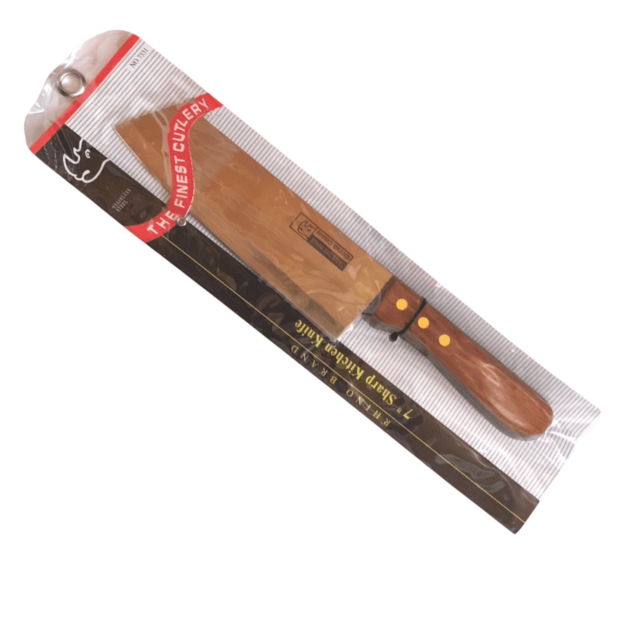 Laadukas Japanilainen Rhino Brands kokkiveitsi, jossa on 17 cm pitkä teräosa ja miellyttävän tuntuinen puinen kahvaosa.