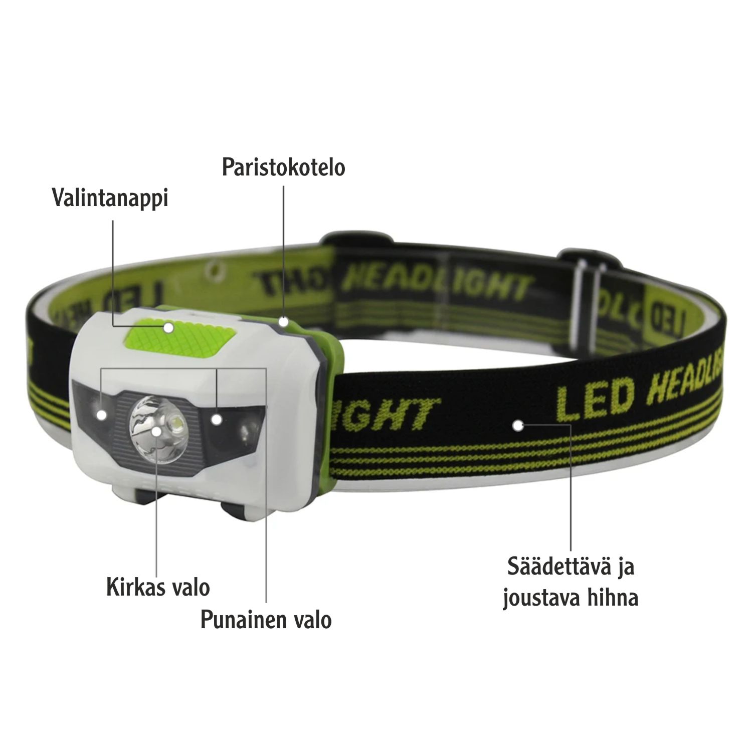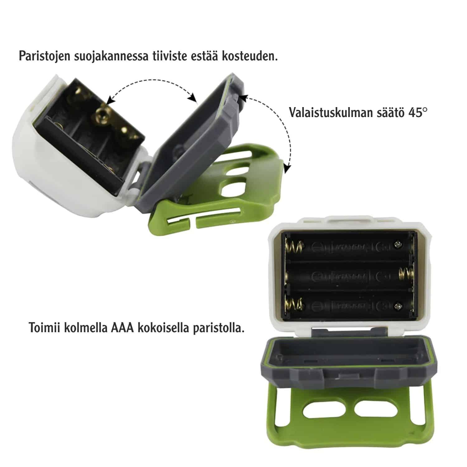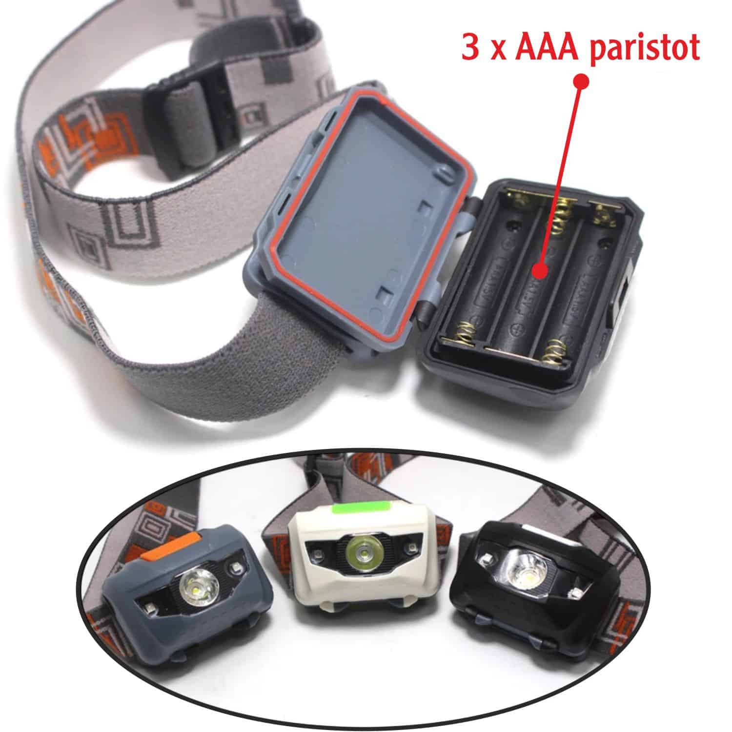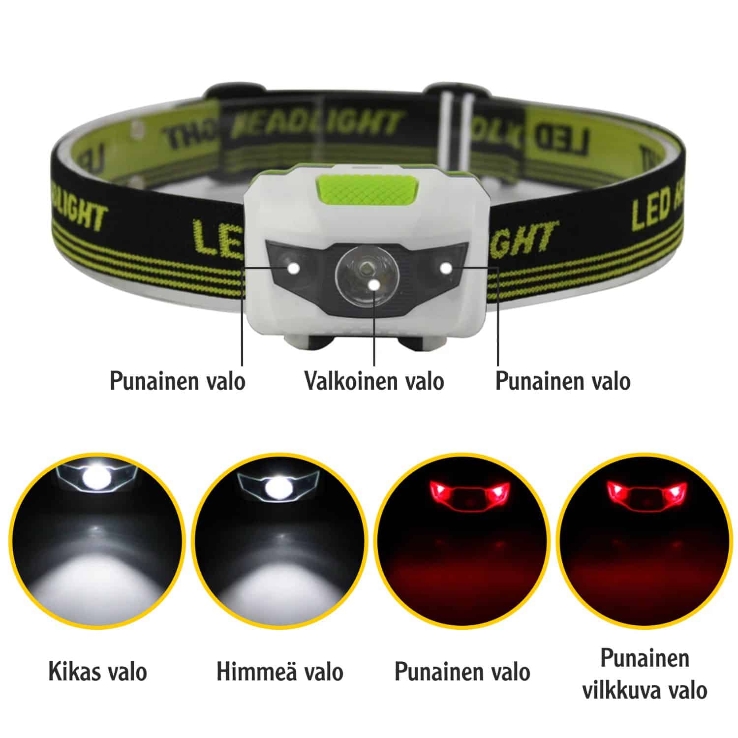 Otsalampussa on kirkas valo, himmeä valo, punainen valo ja vilkkuva punainen valo vaihtoehdot. Otsalamppu toimii kolmella AAA kokoisella sormiparistolla.