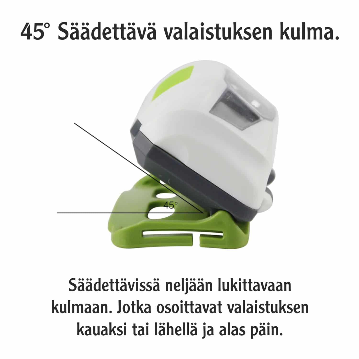 Näppärän kokoinen otsalamppu jossa on neljä eri valotoimintoa, säädettävä valaistuksen kulma sekä säädettävä otsahihna.