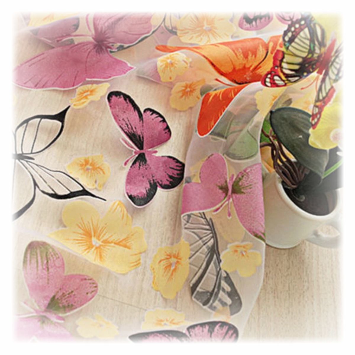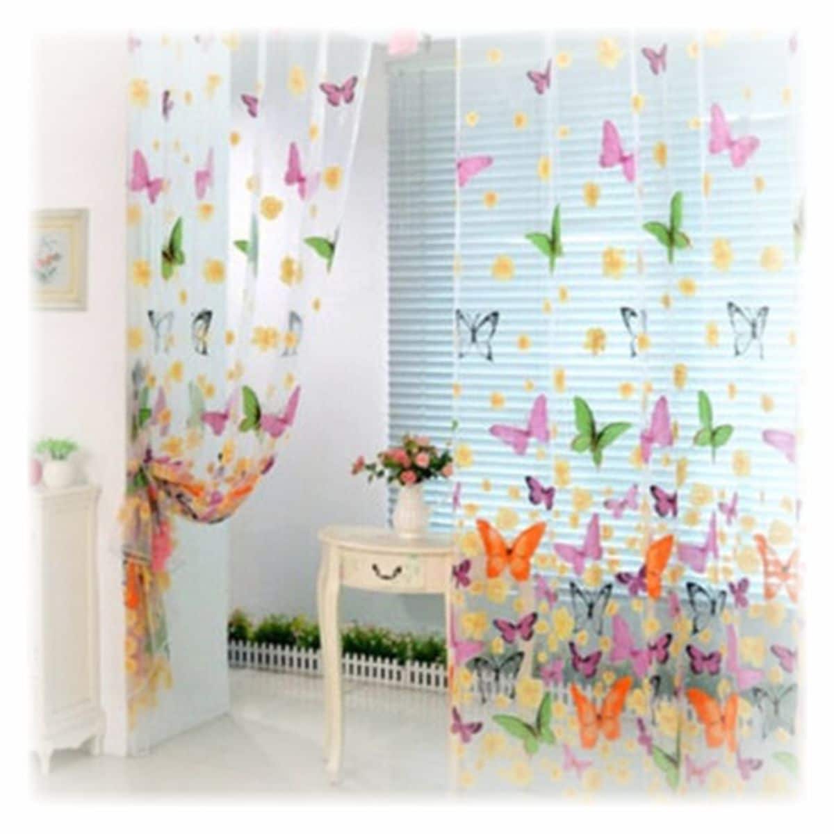 Kauniin kevyet perhosaiheiset verhot, joissa ommelkuja ripustamista varten.